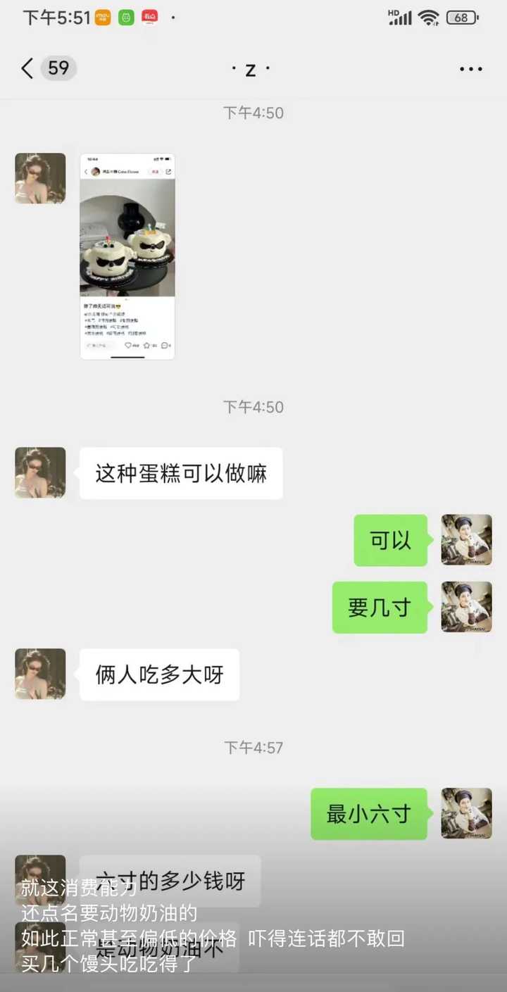 而截图里,顾客就是很正常地在问老板: “两人吃,多大的蛋糕合适”、“是动物奶油吗”这类问题。 |