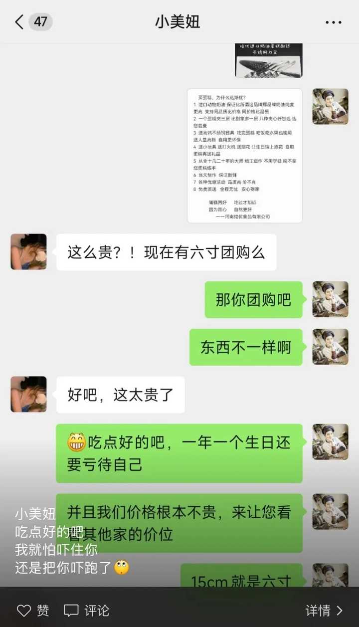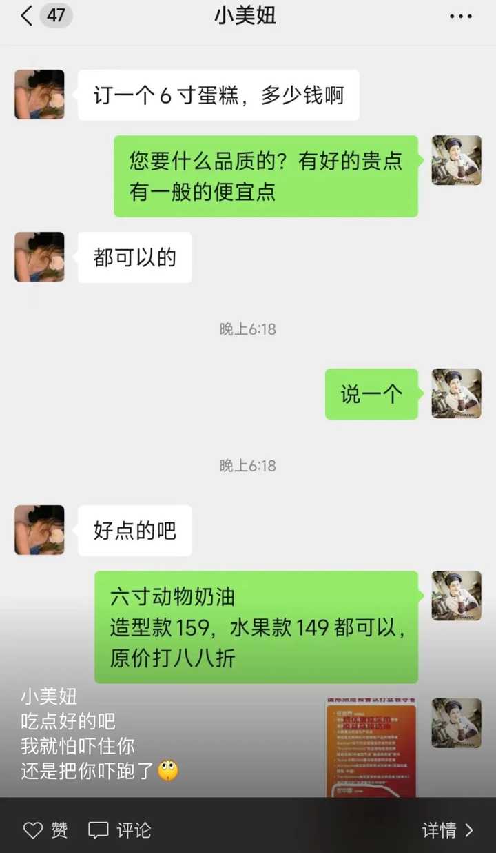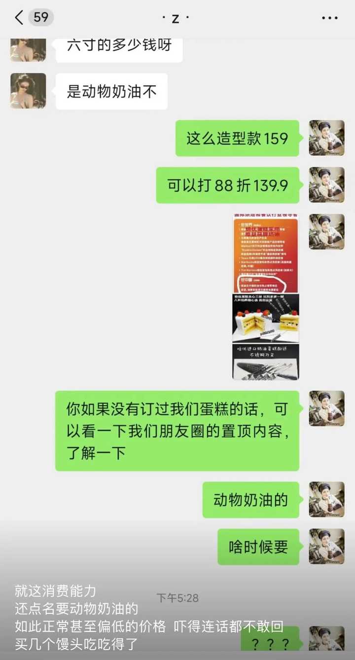 看到这条朋友圈的路人,也就是发帖人,实在看不下去了,就评论了句:“两人吃四寸刚好。” 结果老板阴阳怪气地回复:“买四寸千万别说过生日,会让人觉得好小气。” 这已经不是这个老板第一次这样挂人了,他经常在朋友圈里,尖酸刻薄地嘲讽顾客穷。 比如有人正常地询价,老板跟她说六寸动物奶油要159元,顾客觉得贵,问他有没有团购。 |