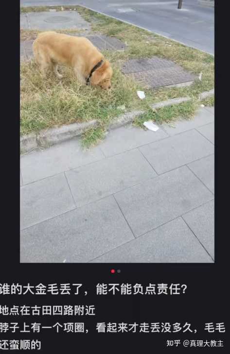抖音上有一个博主,有天外出,在一个十字路口等红绿灯时 无意间看到一只大金毛在过马路 博主当时觉得很危险,不放心,开车掉了两个头跑回去确认情况 当时狗狗还在路边轻松散步、撒尿 但是周围并没有一个像主人的人 于是博主当时就确信这是一只走丢的,或者被弃养的狗子 博主的那个责任感当时一下子就上来了,觉得:啊啊啊啊好惨啊,我一定要帮你。 然后就把狗子带回家了,并且全网找狗子的主人。 后来结果是什么呢? 是狗子主人全网找博主,博主发一条视频,狗主人就评论一条,评论的大致内容是:我是主人;这是我的大黄…… |