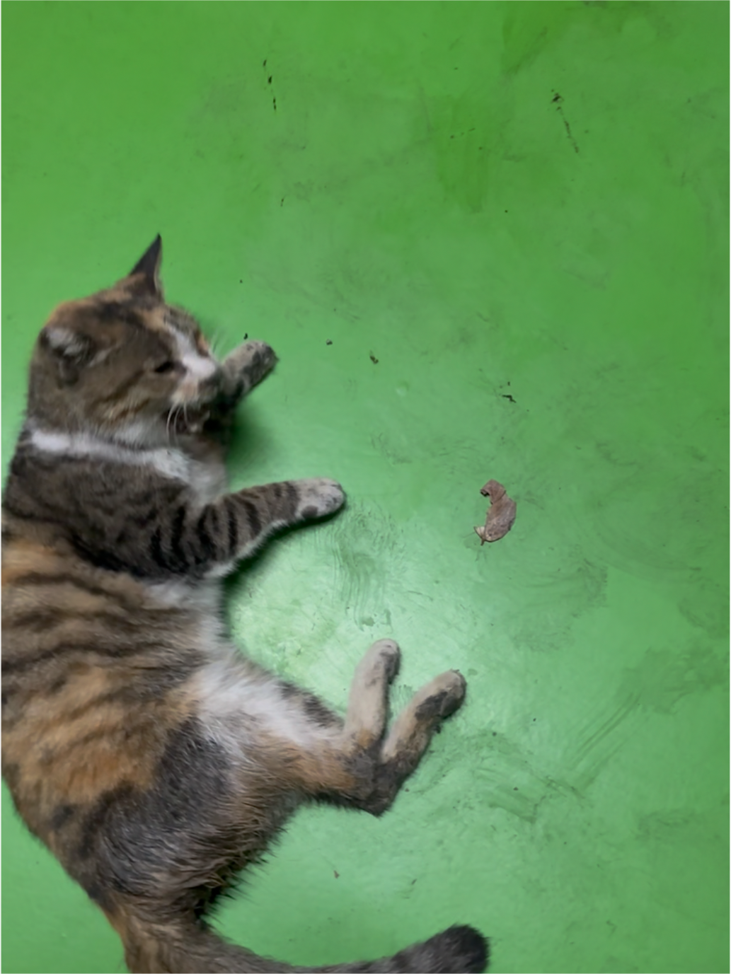 下车观察,地上全是它挣扎爬行的黑色水印。这只猫应该是受伤了,爬到我的车位上就不动了。 |