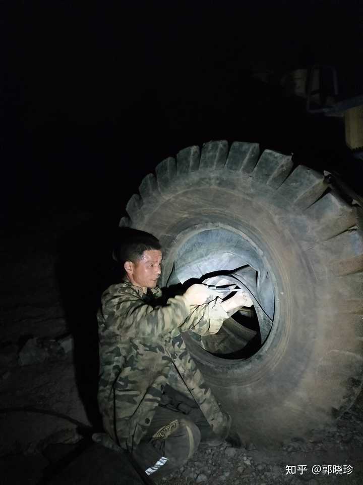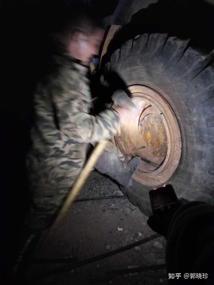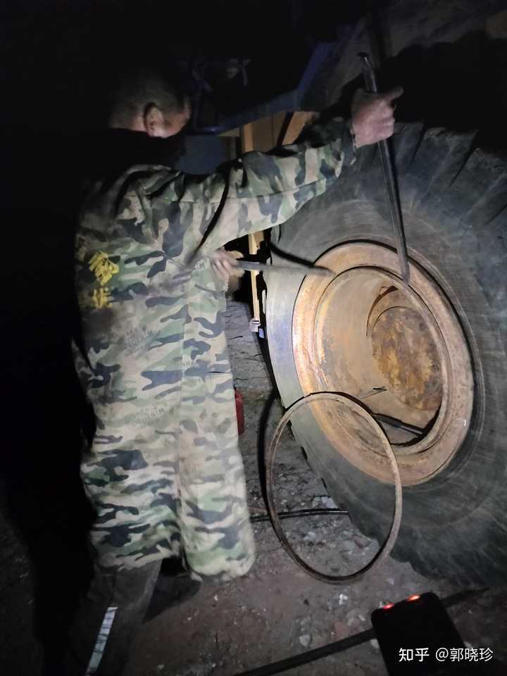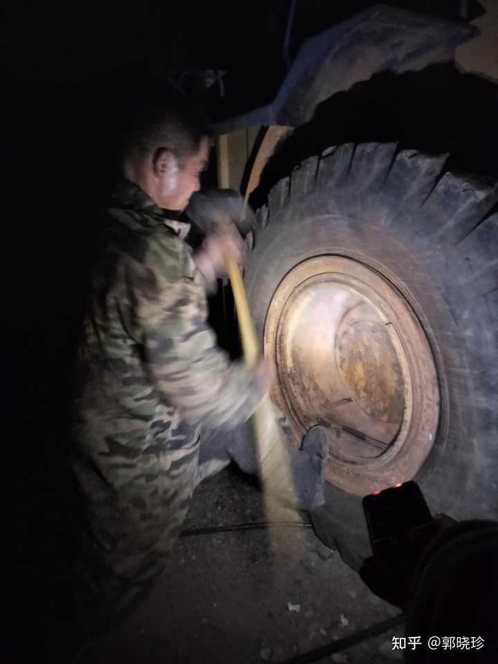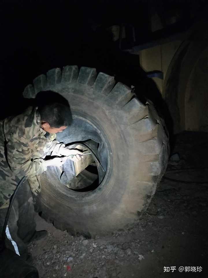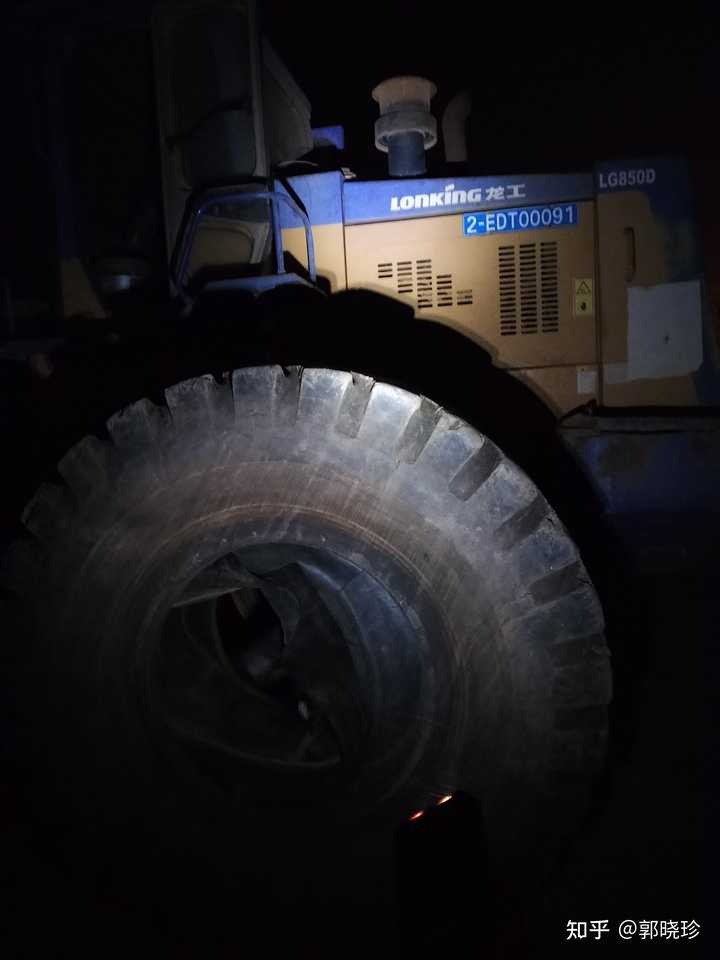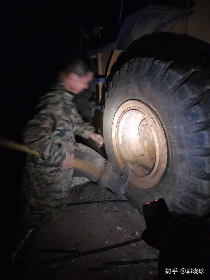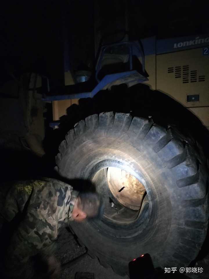 挖掘机一天到晚都在这里转悠,工作时间长,轮胎就要换新的了,就打电话叫一个师傅过来换,他过来的时候天就快黑了,这个师傅就在那里换轮胎,可以看到一点亮光,这不是手电筒,是他带的一个老人手机自带的手电筒。 |