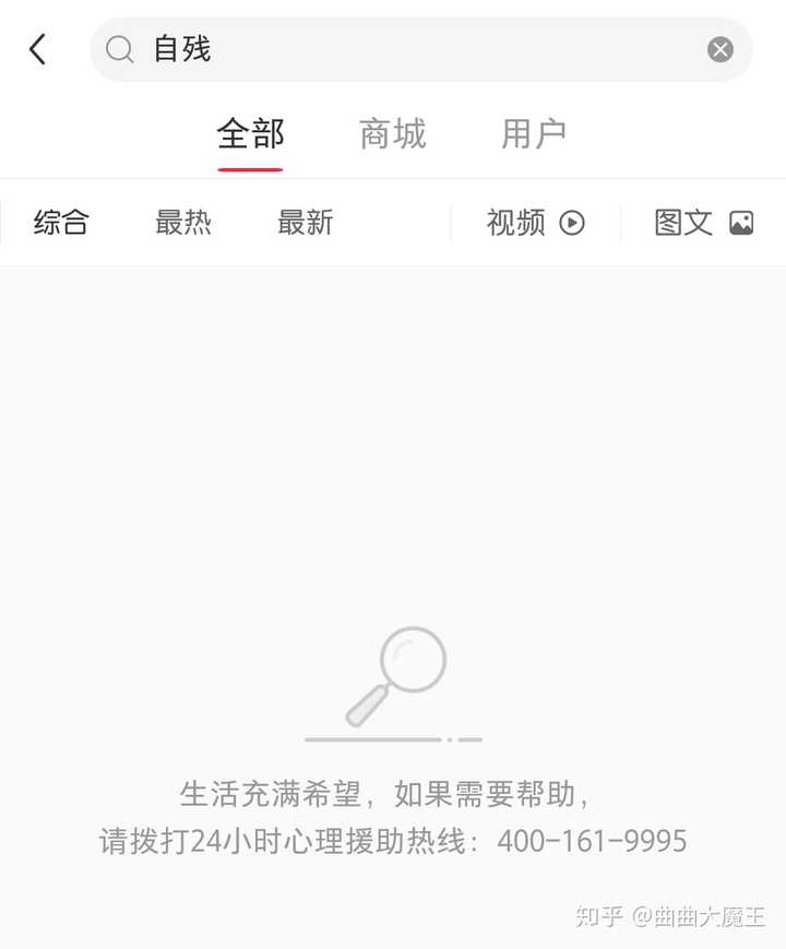 有一阶段特别绝望,在小红书上搜“自残”,然后什么也没搜到,弹出以下如图 |