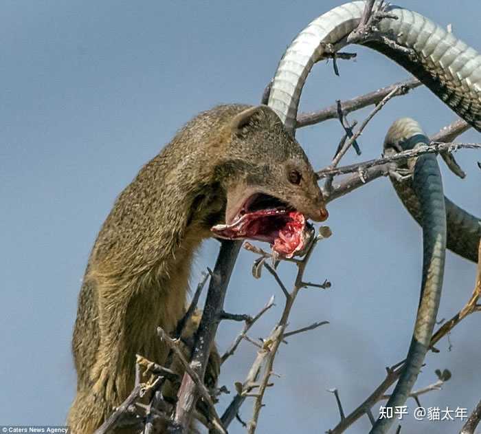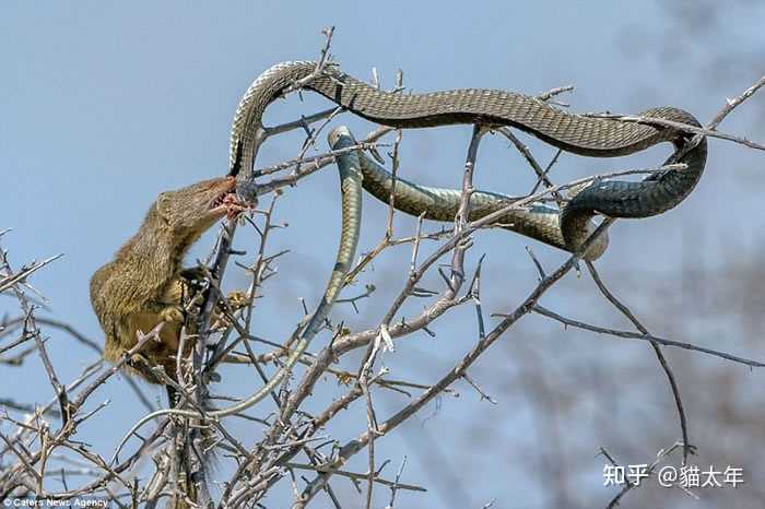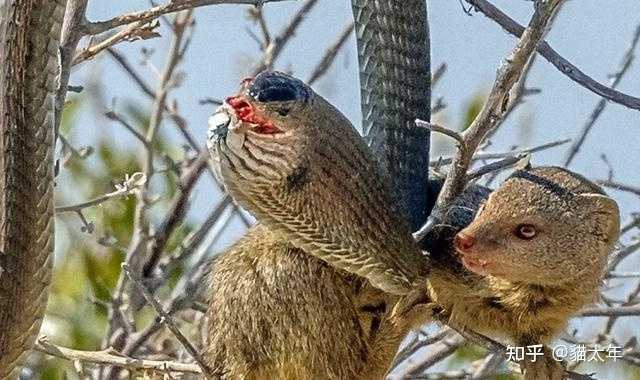 上面一组图。 是2016年左右,由摄影师Elana拍摄于非洲的纳米比亚。 非洲树蛇(剧毒)外出找食物。 遇到了猫鼬大哥。 然后自己成为了食物。 捕蛇,人家是真的专业,胆子大,动作灵活,心思细(瞅着机会一口咬住蛇头),当然,说来说去,还是它们的抗毒能力强,能咸能甜。 |