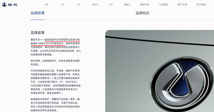 结果就是汉后续疯狂降价,汉系列成了均价不到二十万的普通车,离高端越来越远,千山翠车主更是被背刺的哭都没地方去。十几万的车型,比亚迪还少么?非要把汉也拉到这个区间打架。 然后发展腾势系列,作为高端车型,也就成了一个mvp,主要还是因为市场有空白。跟腾势品牌屁关系没有,汉跟唐几乎是中国人就了解,但谁认识你腾势呢,不就是当年跟奔驰联合成立,就蹭这点点豪华基因?这点破事到现在官网还挂着,豪华品牌,历史就三句话完了,品牌沉淀在哪里?再加上这个不明所以的logo,你这要是写个汉,写个唐,你这品牌历史你就写去吧。 |