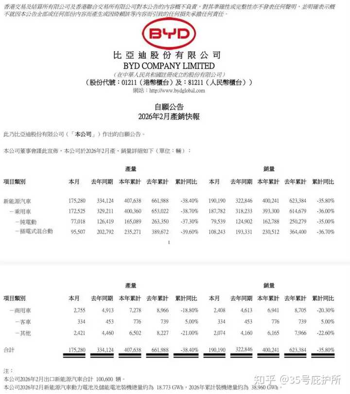 分析来看,比亚迪国内销量持续式微。依据产销快报估算,2月,比亚迪国内销量为8.96万辆,再创其近年来在国内的月度销量新低。 同时,比亚迪2月的国内销量,同比下降64.98%,环比下降18.23%。即比亚迪国内月度销量,出现同比降幅再次扩大的情况。 2025年10月以来,比亚迪国内月度销量呈现下滑态势,同比降幅维持在20%至30%的区间,但2026年1月同比下降53.22%。 作为新能源汽车龙头企业,比亚迪受到新能源汽车购置税新政影响。自今年1月1日起,国内新能源汽车购置税,从全免改为减半征收(税率为5%)。 3月已来,正好迪子3年0息、7年低息政策也来了,加上各地以旧换新政策也于2月陆续落地,再加上马上要新车发布了,何况3月天数也更多,所以,这个3月的销量将会有大幅的提升。 销量的背后,核心就是技术领先、规模效应、前瞻布局等汇聚成的全面综合实力。尤其是在市场竞争加码之后,比亚迪的每一次改变和升级,都成为车市风向标引发跟随,但比亚迪总能够以更快速的技术投入筑起自己的护城河。 对于比亚迪来说,在国内市场稳居销冠宝座之后,下一步就是要不断扩充海外市场的份额,迎来新的销量增长点。多点开花的战略布局正在全球市场生根发芽,更代表了中国汽车工业的崛起,最终会淬炼出真正的世界级车企。 送礼物 还没有人送礼物,鼓励一下作者吧 |