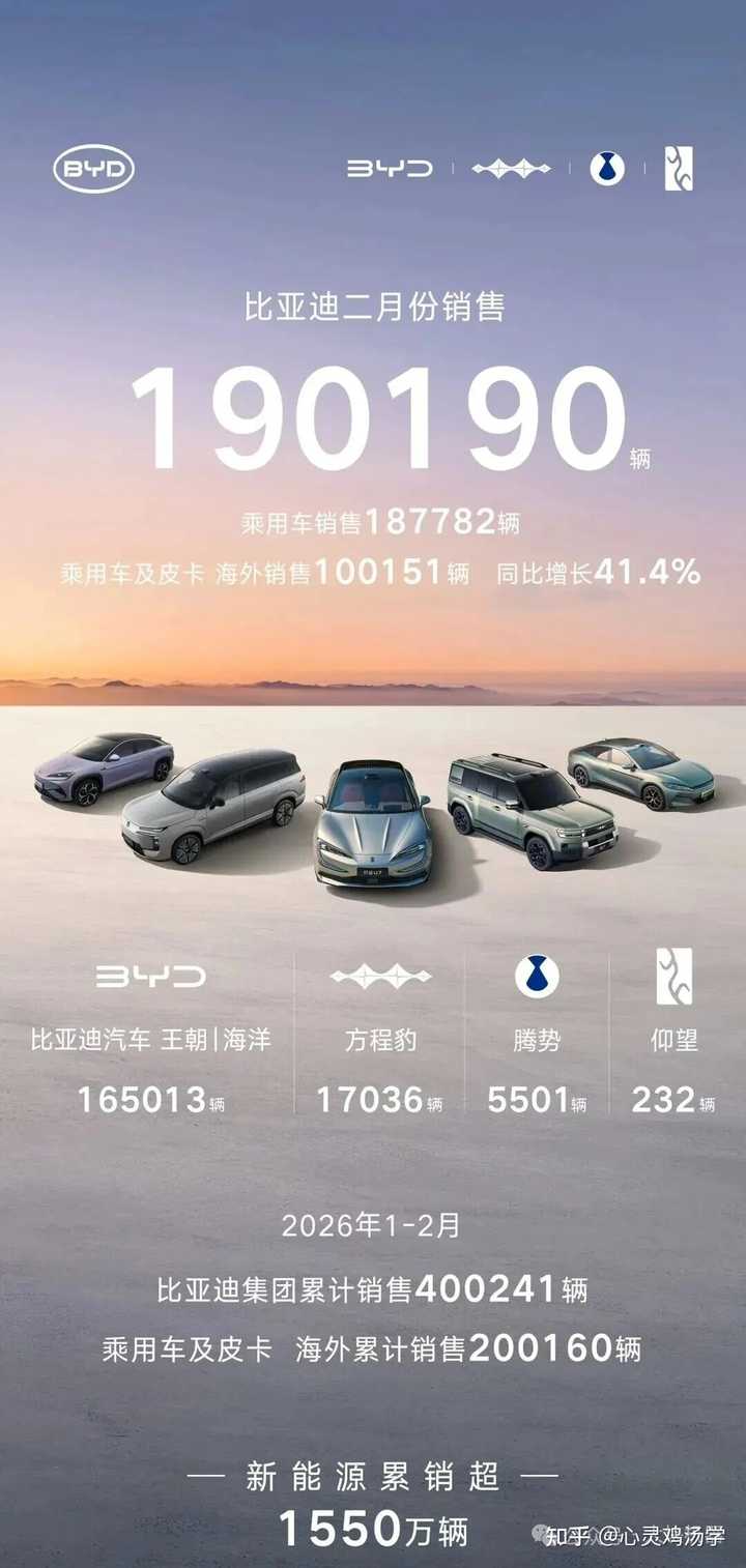 出乎意料,本身2月28天叠加春节9天假期,销量大砍才对,小米从1月的3.9w降到2w、零跑1月的从3.2w降到2.8w,蔚来从1月的2.7w降到2.1w,小鹏从2 w降到1.5w,理想微量,极氪微增,迪子这么大体量,3月份还有一众新车发布,国内降2w多真的可以接受! 国外销量连续两个月超过10w,造船出海提前布局国际市场真是一步妙棋!25年下半年及26年贡献了太多销量,而且利润还高,不用死卷国内! 继续相信技术为王的比亚迪会卷土而来!120度纯电大电池,混动200+/300+电池、DM6.0、天神之眼 B下方、兆瓦闪充普及等技术升级下放,大字辈王朝车型上市,期待一手3.5技术发布会!迪子怎么高调用"重磅"两个字? 26年最期待腾势能不能摆脱腾1w!汉唐高端做不做得起来!方程豹能不能稳住3w!大2w也相当可以! |
