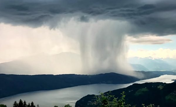 天堂的海啸 - 惊人的暴雨瀑布 天空中布满厚厚的云层,大片云朵开始往右移动。 接近湖面时云层中间像是破了个大洞,大量雨水一口气狂泄而下,像是从天空倾倒入湖中,看起来就像是来自天上的瀑布。 雨水入湖之后又泛起巨大的涟漪,场面十分壮观。 |