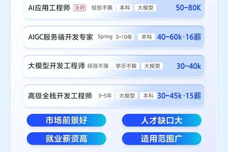 图2 部分本土大模型信息 其中,通用模型24个,用于科研/医疗/政务/公共服务的模型40个,其他均为商业应用及服务提供。值得一提的是,其中开源模型只有几家,名列前茅的,分别是智谱AI和清华大学 KEG 实验室联合发布的ChatGLM,以及百川智能推出的Baichuan 2。 随着我们深入了解人工智能,从科幻作品中的描绘,到第一次尝试对话的新奇体验,再到探索大模型的深层架构,我们正将大模型作为自己在物理世界之外的一种智慧延伸。这些智慧触角终将揭开我们科技未来的迷雾。中国的人工智能之路虽漫长曲折,但我们正稳步走出这个序章,迈向光明的未来。 这次的人工智能大模型浪潮带来了许多机遇,去年大模型算法工程师的平均月薪已超 4w,今年 AI 大模型相关岗位需求增长超 300%,现在正是程序员和产品经理等技术相关人才入局的最佳时机。 你现在不了解也没关系,好在现在学习资源非常多,知乎知学堂的 AI 大模型公开课就非常不错,我前段时间刚听完,尤其是课程里面的教大家定制专属的大模型非常有用,学会了就可以直接用到工作中,入口我放在下面了,现在还是免费的,建议都去看看↓ ??技术岗高薪必学:AI大模型技术原理+应用开发+模型训练 ¥0.00就业无忧 |