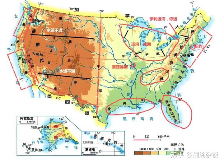 大漂亮的水运劣势体现在哪里呢? 首先,它远离欧亚非这个世界最大的消费市场,所以它的海运成本高。 第二,它的海岸线被割裂成三块,国内的海运不便。 例如从西海岸到东海岸,需要绕行巴拿马运河。即便是从密西西比河出海口到东边,也需要绕行佛罗里达半岛 |