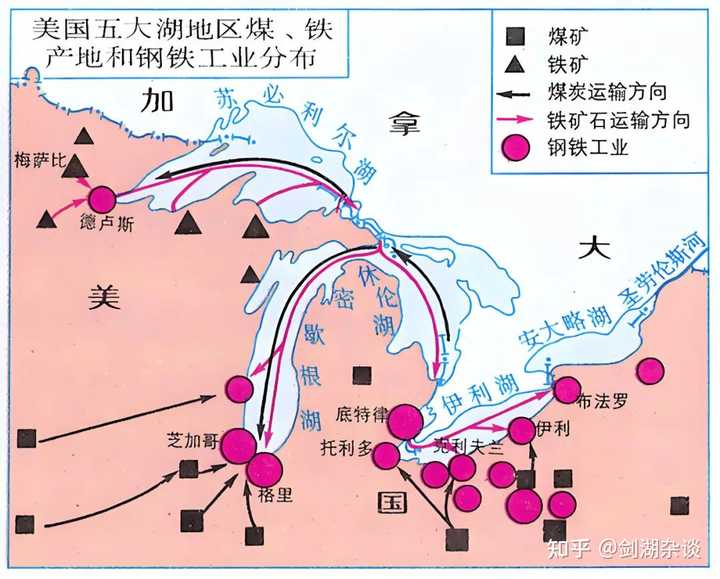 我国的内陆地区也有不少的工业区,分布要远比美国广泛 而大漂亮传统的工业区-五大湖区是地理位置很闭塞的地区。 之所以在这里建设工厂,是在集装箱海运出现前,一般是在靠近资源产地建厂。然后将货物运输出去销售。而五大湖区,刚好有丰富的煤炭和铁矿。 |