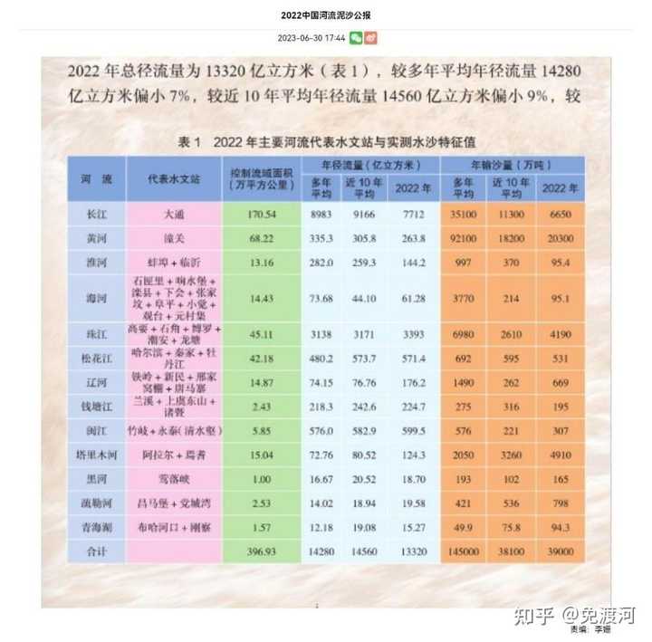 2022年中国河流泥沙公报 之所以黄河走哪淤哪儿,怎么流都能流成地上河,而长江,除了特殊河段(荆江),下游大部分河段没有形成地上河。 这主要得益于长江的水量。 水量较大,就有充足的动力,将泥沙冲入大海,而不是淤积在河道中。 长江近10年平均年径流量9166亿立方米,输沙量11300万吨,平均下来八千立方米的水,冲一吨沙入海。 黄河近10年平均年径流量305.8亿立方米,输沙量18200万吨,平均下来,168立方米的水,冲一吨沙入海。 水太少了,冲不动啊。 就算加上调水调沙,用水库攒着水集中冲,也很吃力。 长江与黄河相比,简直轻松简单小case。 如果把长江的水量换给黄河,用九千亿立方米的水,冲一亿八千吨沙,那么黄河也不会有如此严重的地上河问题。 也就不会频繁的千里大漂移。 至少漂移的频率会低很多很多。 |