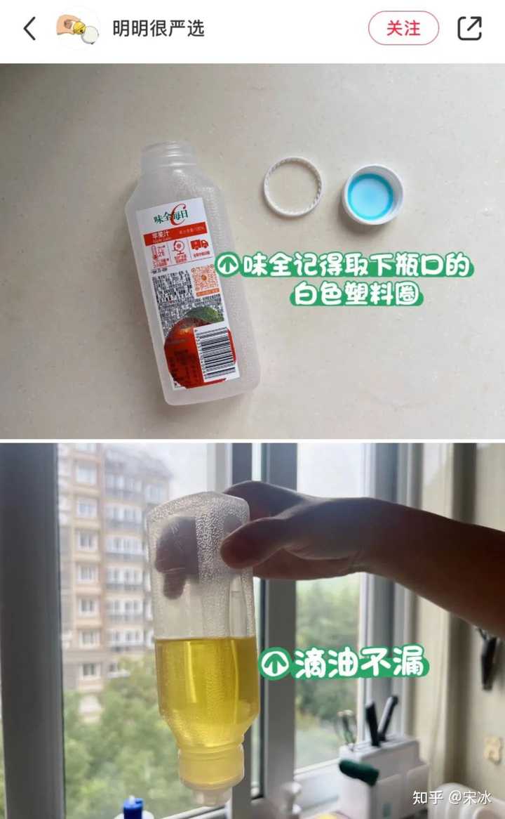 图源小红书@短腿表姐 7、味全果汁的瓶身和尖叫的瓶盖都是PP5材质,可反复利用,自制油壶非常好用!瓶口不挂油,瓶身软硬适中,用量可控,用完就扔也很方便。 |