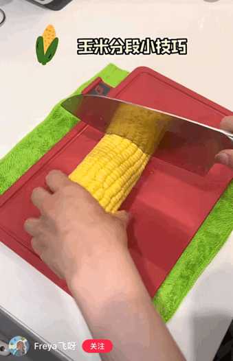 图源花王attack官推 5、用菜刀剁玉米,这样做不伤菜刀菜板也不会乱崩:先浅浅切一刀,然后菜刀反过来,玉米在上刀在下,用刀背磕菜板,震两下就OK~ |