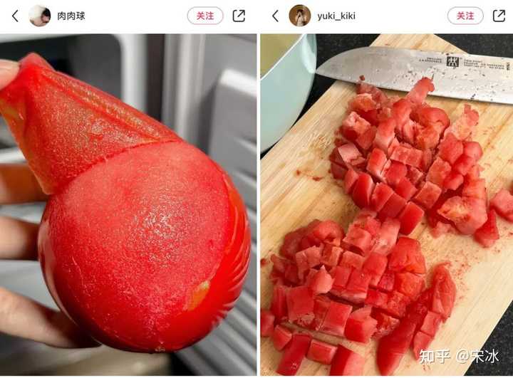 图源小红书@外星人蒋炎诺 23、西红柿整个放冷冻室,用之前不用解冻,拿出来水冲一冲就能轻松去皮,切块切丁不会流一菜板的番茄汁,关键是特别容易出沙! |