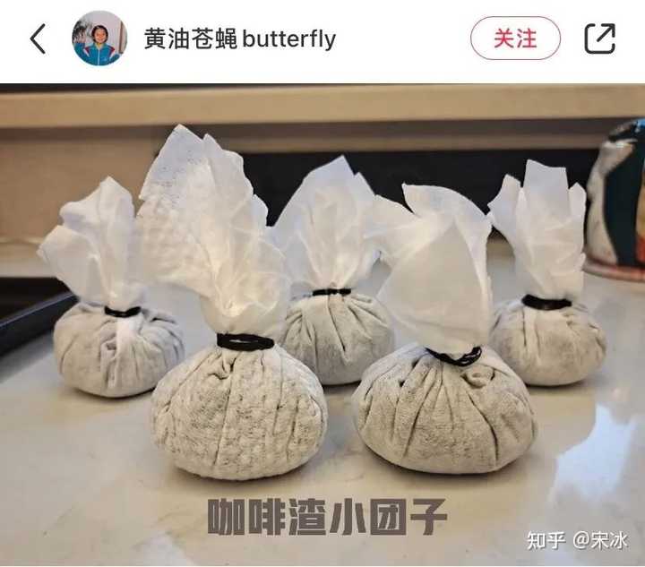 图源小红书,来源见账号 20、用过的(干)洗脸巾也别浪费,烘干的咖啡渣放进去扎紧,放进冰箱除味效果很棒~ |