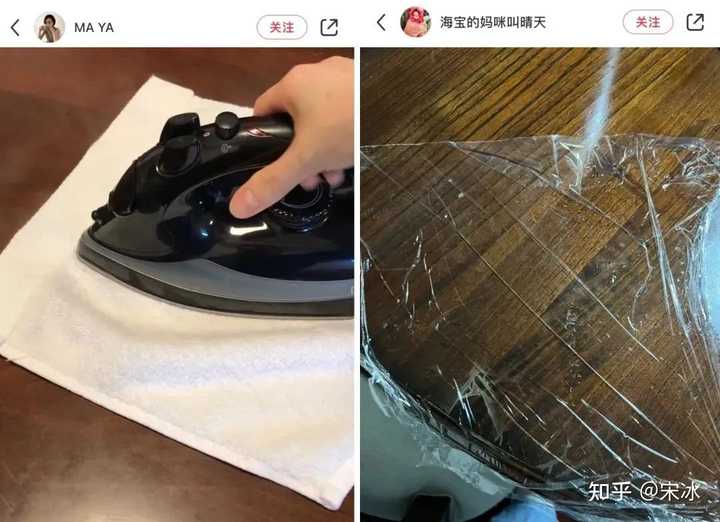 图源小红书,来源见账号 30、实木桌子被烫出白斑,推荐尝试的方法有: 1)直接用吹风机吹; 2)垫上干棉布用熨斗熨; 3)喷酒精/花露水/香水之后盖上保鲜膜。 |