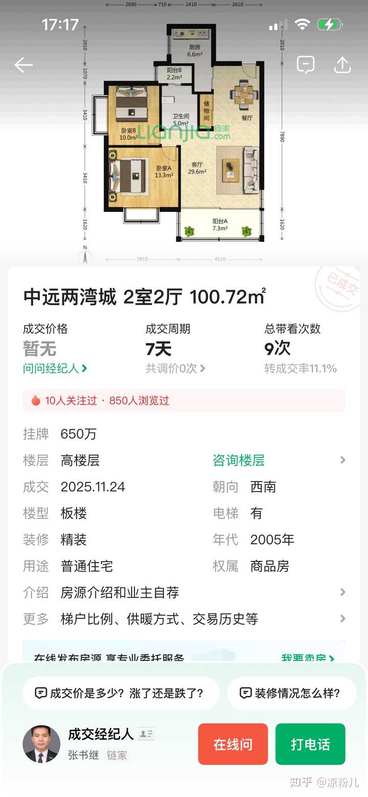 两湾城严格意义上我觉得更像是塔楼,户型比较多但也大都比较差,南北通的户型在高点是相当抢手,这套算是西边户型又是高区,一进门就很亮堂,当即有点想坐下来谈,中介告知950w且税费买方全包(以前买卖全国好像都是买方付税),全部费用算下来1kw,当时1kw买个两室对于我们即将生孩子的家庭真的蛮难下手的。之后看了几套难以言喻的户型之后还是回家冷静冷静了,半个月后中介告诉我935w成交了,说实话当下是松了一口气,幸好有人买了不然真让我去谈我还真不一定想买了。 一眨眼就来到了23年6月,我们的五年社保满足期限了,我们又陆陆续续看了几套房,房价开始下跌了,我们俩的心态开始变化了,一种看笑话的心态出来了,想看看房价走势到底如何,就搁置了买房计划。巧的是,同年7月还卖掉了两套江苏的房子(现在每套跌了近50w)。 这两天刷到同户型的房子成交价来到了607w!真的是惊人的607啊!第一时间发给了中介询问情况,靠近地铁噪音较大。但是!这个跌幅还要谈什么缺点啊!而且它还多了10平! |