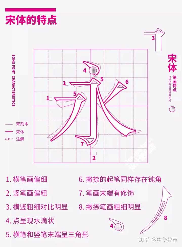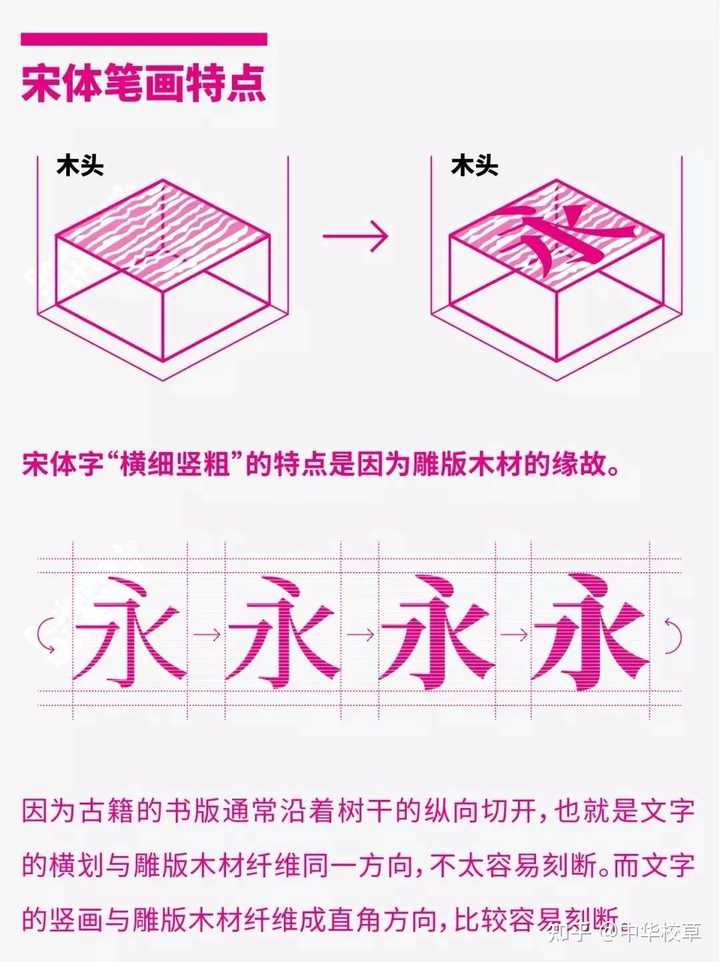 (二)宋体。也称书宋。宋体诞生之初是为了印刷而来,匠人们为了刻板省时省力,会将横画刻的很细,而竖画过细容易损坏,不利于反复使用,所以就形成了现在宋体横细竖粗的笔画特征。而对于曲线笔画的处理通常是“能省则省”,横竖笔画绝对平直,起笔落笔都有棱角。因为宋体横向笔划比较细,难以识别,用宋体字号较小时容易让人看了眼花,所以现在正文主要采用仿宋字体。 |