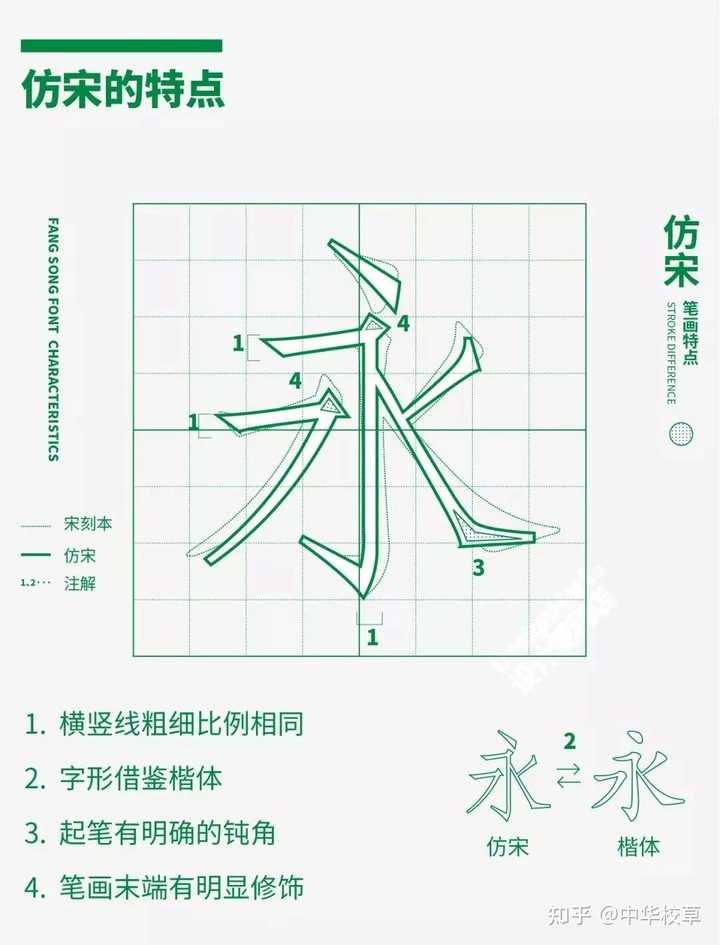 (三)仿宋。由古代的仿宋刻本发展而来,为适应现代印刷技术而产生的印刷体。笔画粗细一致,起落锋芒突出,字体均匀统一,相比于宋体字,仿宋体字整体更为端庄、工整,透露出严格的规范性。也许正因如此,仿宋字体成为当今政府公文的正文或其他较为正式场合的主流用字。 |